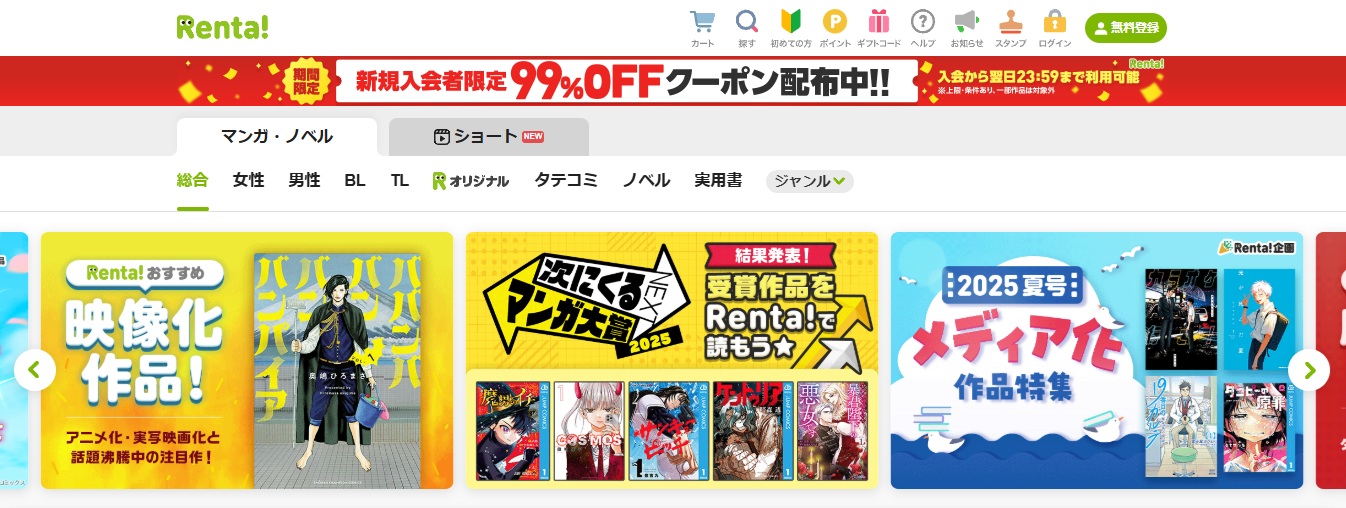Renta!は名前の通り「レンタル型」の電子書籍サービスで、48時間レンタルから利用できる作品が多数揃っています。まずは安く読みたい人や、気軽に試してみたい人に便利な仕組みで、気に入った作品は無期限レンタルや購入に切り替えることも可能です。