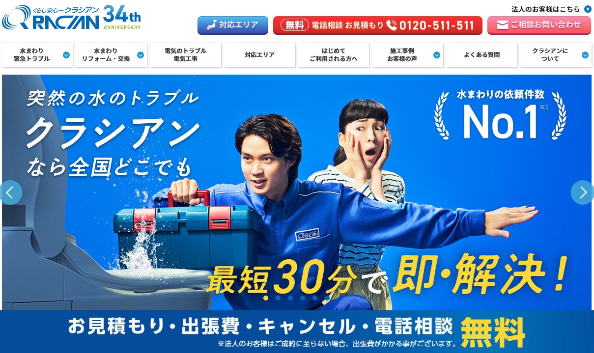 クラシアンは水回りのトラブルに迅速に対応する修理・サービスを提供する企業です。全国対応の体制を整えており、24時間365日いつでも相談や依頼が可能な点が大きな魅力です。トイレの詰まりや水漏れ、蛇口の交換など幅広い水回りの問題に対応し、安心できる料金体系と確かな技術で多くの家庭や事業所から信頼を得ています。
