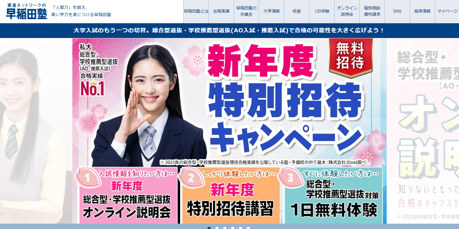 早稲田塾は、難関大学の総合型選抜や学校推薦型選抜に特化した指導で知られる進学塾です。学力対策だけでなく、志望理由書や小論文、面接対策まで一貫してサポートする点が特徴です。早い段階から進路意識を高め、将来像を言語化する指導を重視しており、自分の強みや興味関心を深く掘り下げながら受験に臨める環境が整っています。
